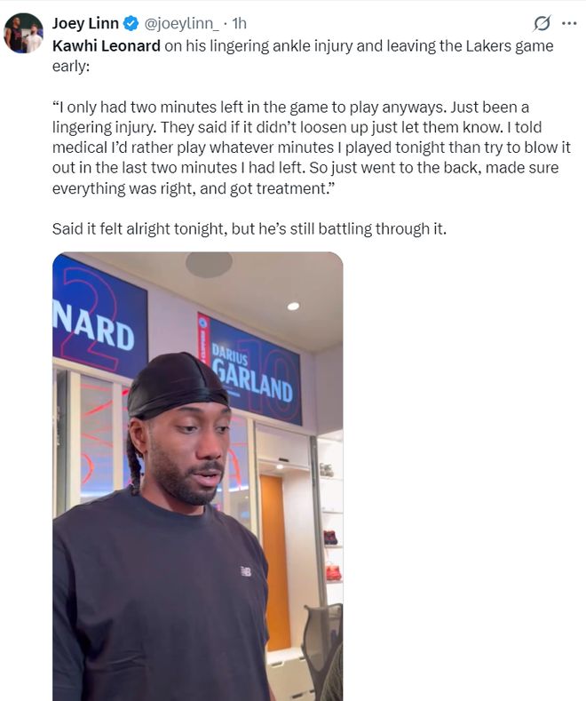 賽后倫納德談到了自己的腳踝傷病與登場時間限制的話題,他表示:因為我一直有傷在身,所以有些比賽有登場時間限制,我跟醫(yī)療團隊說這場比賽能打多少分鐘就打多少分鐘,對陣湖人最后幾分鐘我經(jīng)過檢查后被強制留在替補席,今晚我的感覺還不錯。