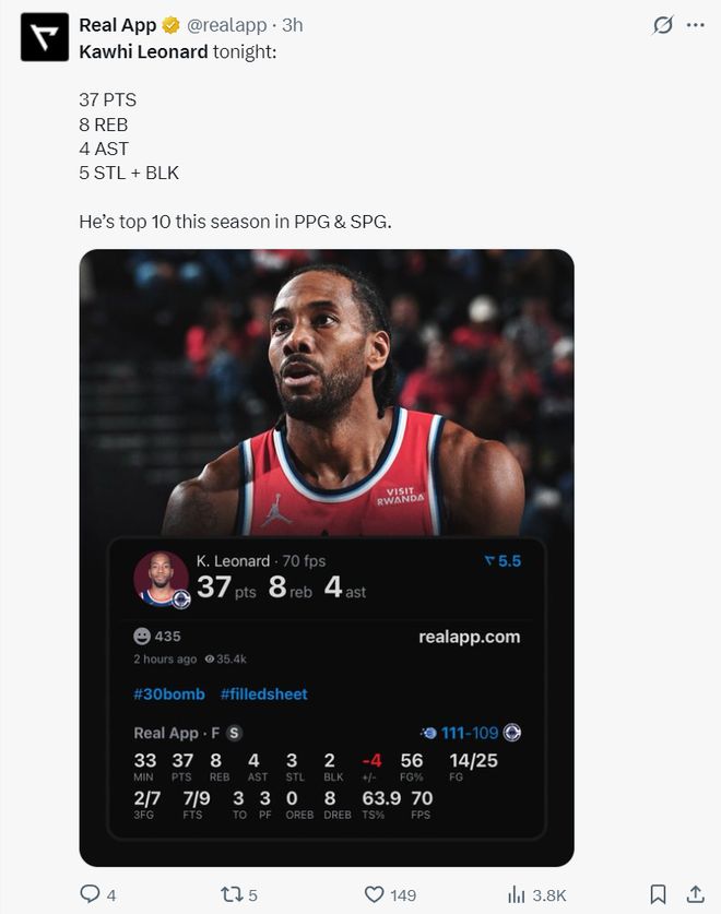 本賽季他得分、搶斷、利用失誤得分、罰球命中率、快攻得分都是聯(lián)盟前十的存在,34歲的倫納德真的進入巔峰期了。