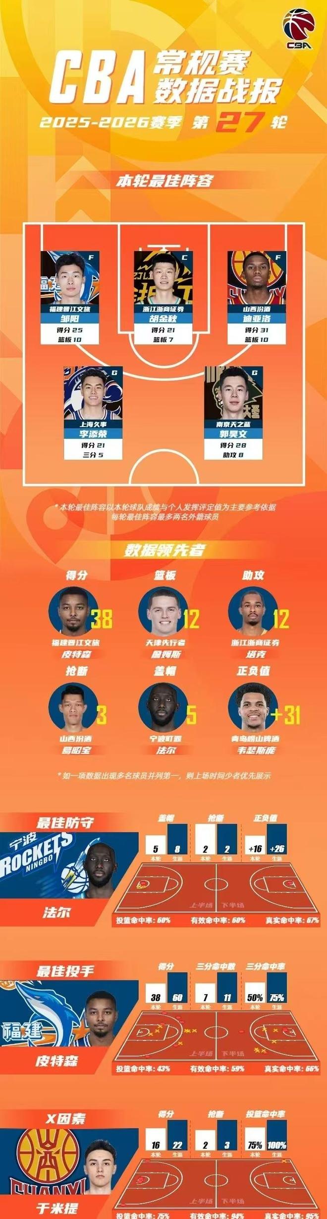 CBA官宣常規賽第27輪最佳陣容,鄒陽轟下25+10,尤其是末節獨得12分,幫助福建爆冷戰勝北京,領銜入選最佳陣容。此外,胡金秋、郭昊文、李添榮與迪亞洛也入選最佳陣容。