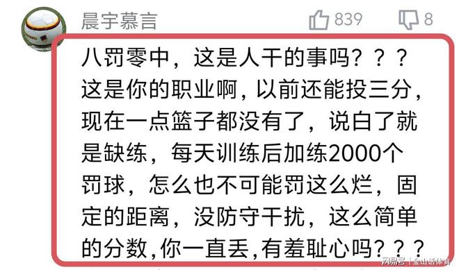 號稱國內第一中鋒的周琦,在罰球線災難性的表現,也遭到網友們的紛紛吐槽?!鞍肆P零中,這是你的職業啊,以前還能投三分,現在一點籃子都沒有了,說白了就是缺練,每天訓練后加練2000個罰球,怎么也不可能罰這么爛,固定的距離,沒防守干擾,這么簡單的分數,你一直丟,有羞恥心嗎???”;“周琦 你這是職業球員? 我讓我九歲的女兒,罰八個球她都不可能說一個不進,我一個老農民,單手也都不可能八罰不進,真的是悲哀!”。