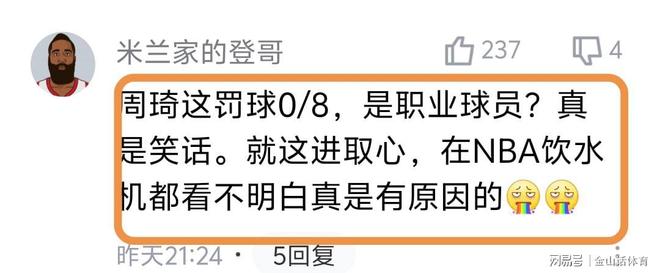 “周琦這罰球0/8,是職業球員?真是笑話。就這進取心,在NBA飲水機都看不明白真是有原因的?!保弧奥殬I球員,上場14罰中5,這場更離譜,8罰全飛,我平時不打籃球,5罰至少也能進一個”“8中0,和街溜子有啥區別?”……