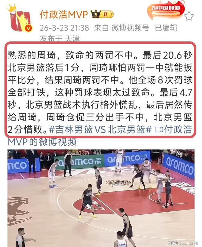 針對周琦在罰球線糟糕的表現,著名媒體人付政浩賽后發文表示“熟悉的周琦,致命的兩罰不中。最后20.6秒北京男籃落后1分,周琦哪怕兩罰一中就能扳平比分,結果周琦兩罰不中。他全場8次罰球全部打鐵,這種罰球表現太過致命。最后4.7秒,北京男籃戰術執行格外慌亂,最后居然傳給周琦,周琦倉促三分出手不中,北京男籃2分惜敗?!薄?/p>