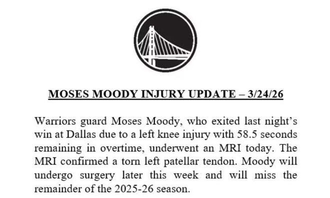 北京時間3月25日,據名記Shams報道,ESPN消息源透露,金州勇士后衛穆迪確診為左膝髕腱撕裂。穆迪這個生涯最佳賽季就此報銷,他將需要進行漫長的康復治療。隨后,勇士官方宣布了這一消息,并表示穆迪將在本周晚些時候接受手術。名記Siegel表示,穆迪預計還將缺席2026-27賽季大部分比賽。