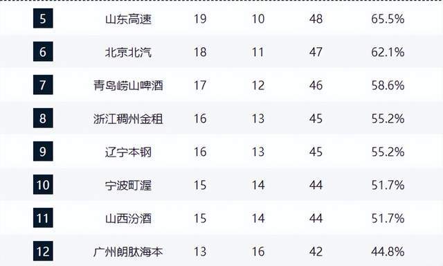青島隊(17勝12負)、浙江隊(16勝13負)分列第七、第八,近期連敗后優勢縮水。遼寧隊以16勝13負升至第九,近8戰7勝,展現出強勁復蘇態勢,八強席位觸手可及。寧波隊(15勝14負)、山西隊(15勝14負)緊咬季后賽邊緣。