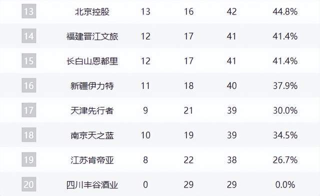 廣州隊與北控隊同為13勝16負,暫居第11與第13,成為“季后賽守門員”。福建隊(12勝17負)、吉林隊(12勝17負)、新疆隊(11勝18負)仍存理論晉級可能。天津隊(10勝19負)、同曦隊(10勝19負)陷入保級泥潭,江蘇隊(8勝22負)難求一勝,四川隊則延續29連敗,賽季已無懸念。