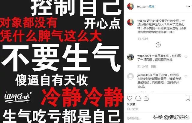 蘇若禹還曬出了一張圖,圖上寫著“不要生氣”、“控制自己”、“開心點”、“傻X自有天收”、“冷靜冷靜”等字樣。