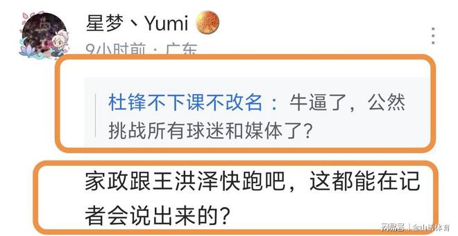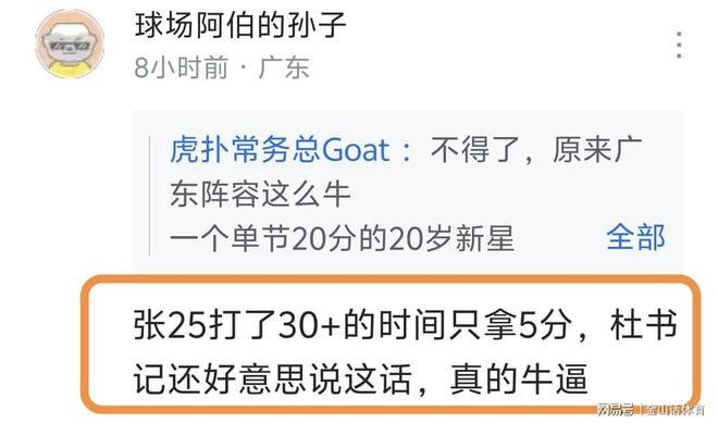 “多年廣東球迷,謝謝杜指導(dǎo)之前的付出,現(xiàn)在可以帶上25離開(kāi)廣東隊(duì)了”;“張25打了30+的時(shí)間只拿5分,杜書(shū)記還好意思說(shuō)這話(huà),真的牛逼!”;“家政跟王洪澤快跑吧,這都能在記者會(huì)說(shuō)出來(lái)的?”……