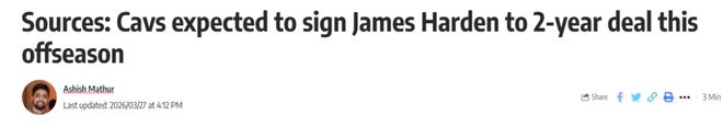 北京時間3月28日,據Cavaliers Nation消息人士透露,克利夫蘭騎士預計將在今年休賽期與詹姆斯-哈登簽下一份兩年合同。
