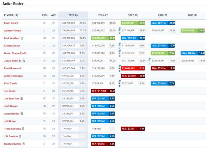 那么將戴維森轉正后,火箭就會帶著15份全額保障合同進入季后賽:戴維森、杜蘭特、申京、范弗利特、亞當斯、芬尼史密斯、小賈、謝潑德、阿門、卡佩拉、伊森、泰特、奧科吉、霍勒迪、杰夫-格林。